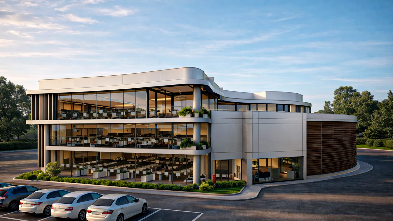 volumes contínuos e grandes planos de vidro