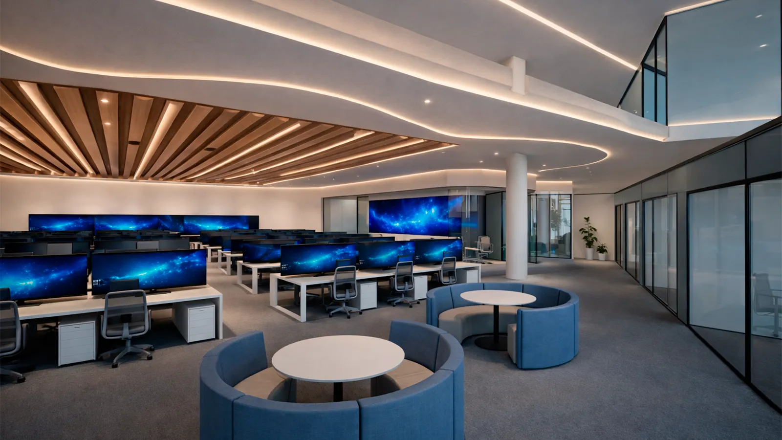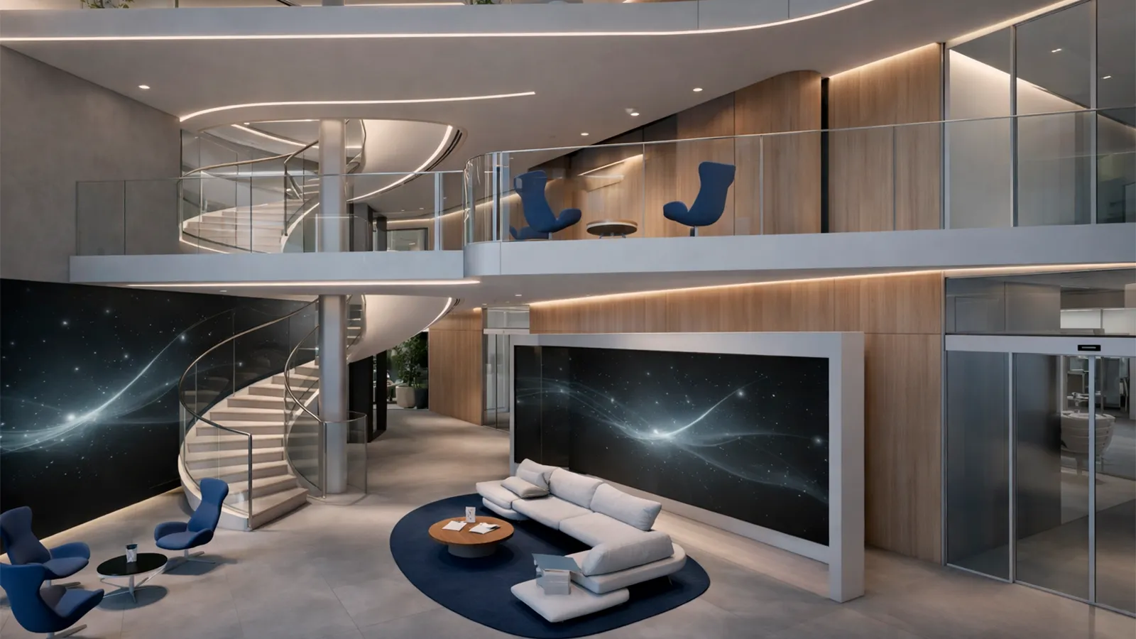 futurista e institucional, com linhas curvas,